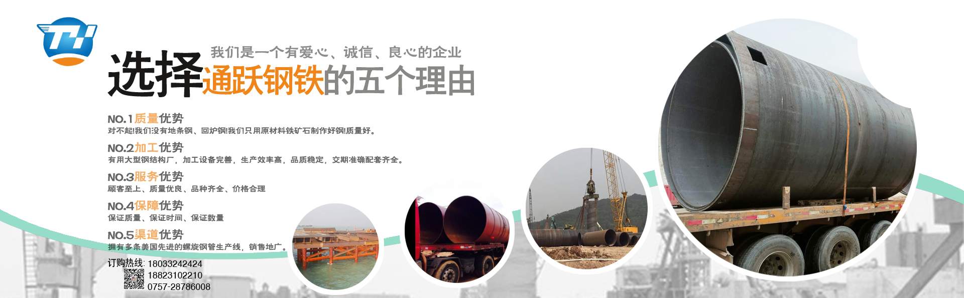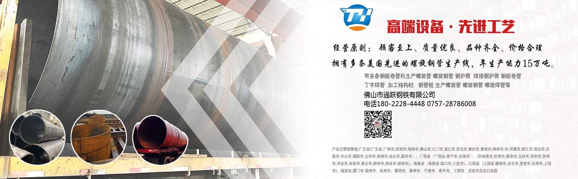 佛山市通躍鋼鐵有限公司 電話(huà)180-2228-4448 0757-28786008 擁有多條美國(guó)先進(jìn)的螺旋鋼管生產(chǎn)線(xiàn),生產(chǎn)直徑φ159-φ3620mm(壁厚6mm-20mm)的雙面埋弧螺旋焊鋼管,年生產(chǎn)能力15萬(wàn)噸。 生產(chǎn)螺旋管 螺旋鋼管 螺旋焊管 規(guī)格厚度6mm-20mm 直徑159mm-3620mm 有多條鋼板卷管機(jī)生產(chǎn)規(guī)格厚度6mm-70mm 直徑400mm-5020mm 螺旋管 螺旋鋼管 鋼護(hù)筒 焊接鋼護(hù)筒 鋼板卷管 丁字焊管  加工格構(gòu)柱 鋼管樁 材質(zhì)Q235B Q345B Q235A 45# 20# Q420D Q390··· ……
